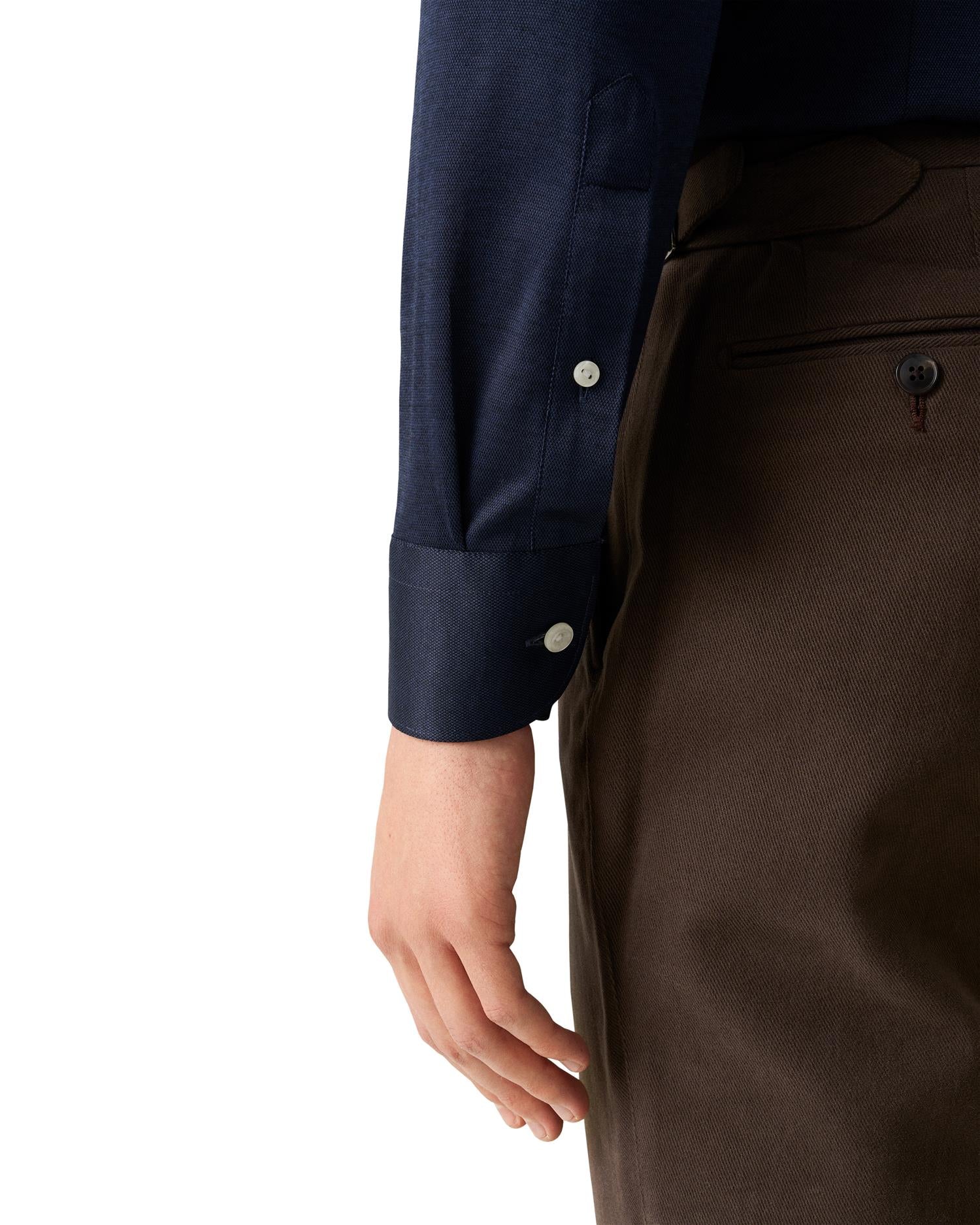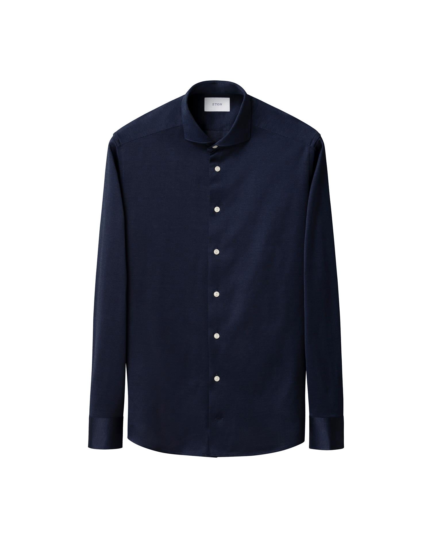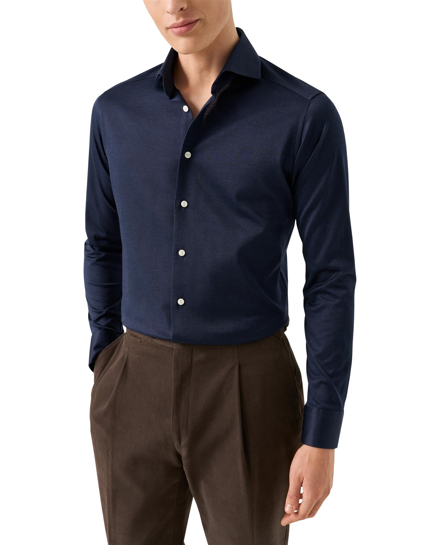 En skjorte laget av mercerisert Filo di Scozia-bomullsjersey, jacquardstrikket for en subtil tekstur og struktur. Naturlig pustende og myk mot huden, med et mykt fall og en mild glans. Forhøyet med ton-til-ton knapper – designet for moderne komfort med en polert finish.