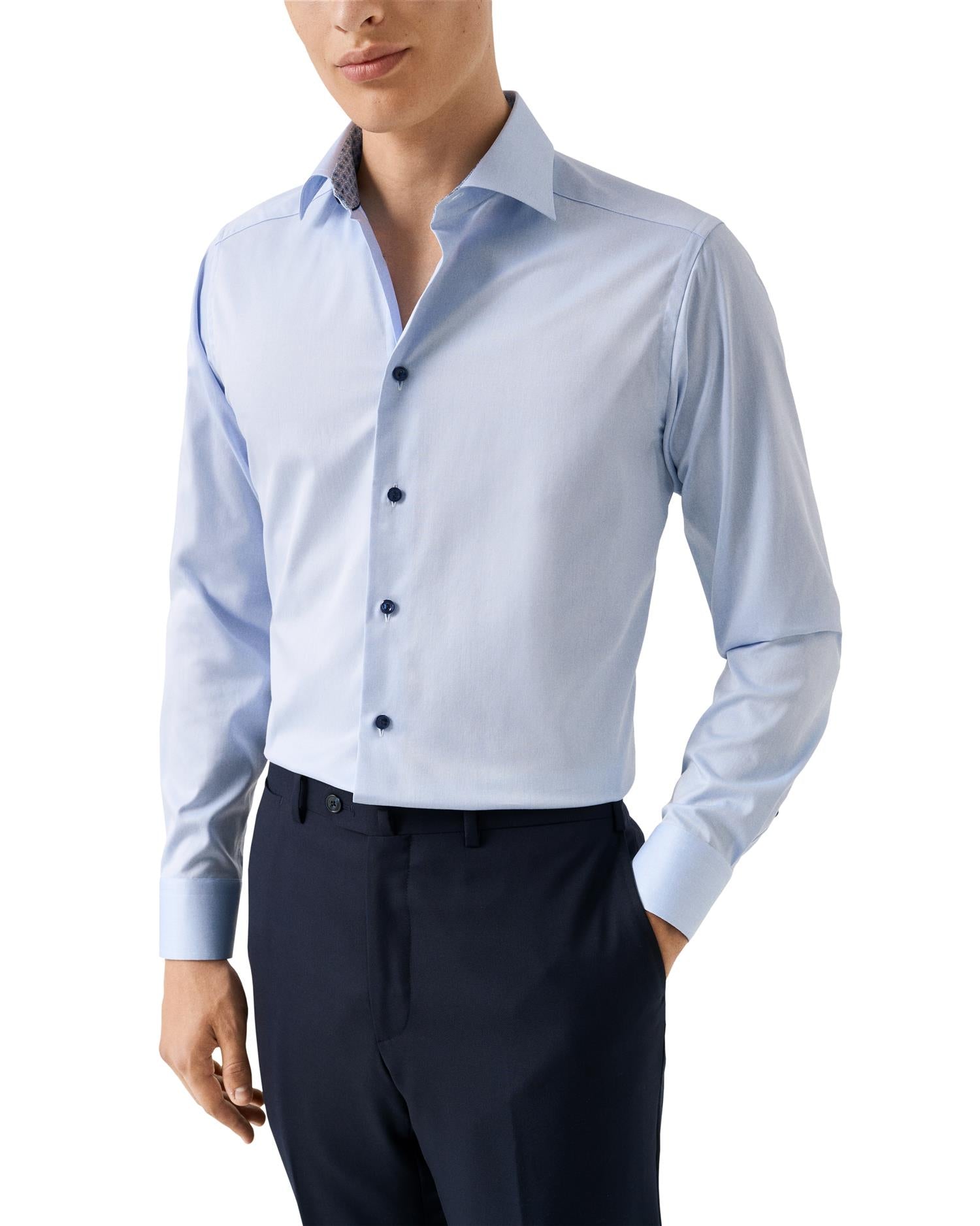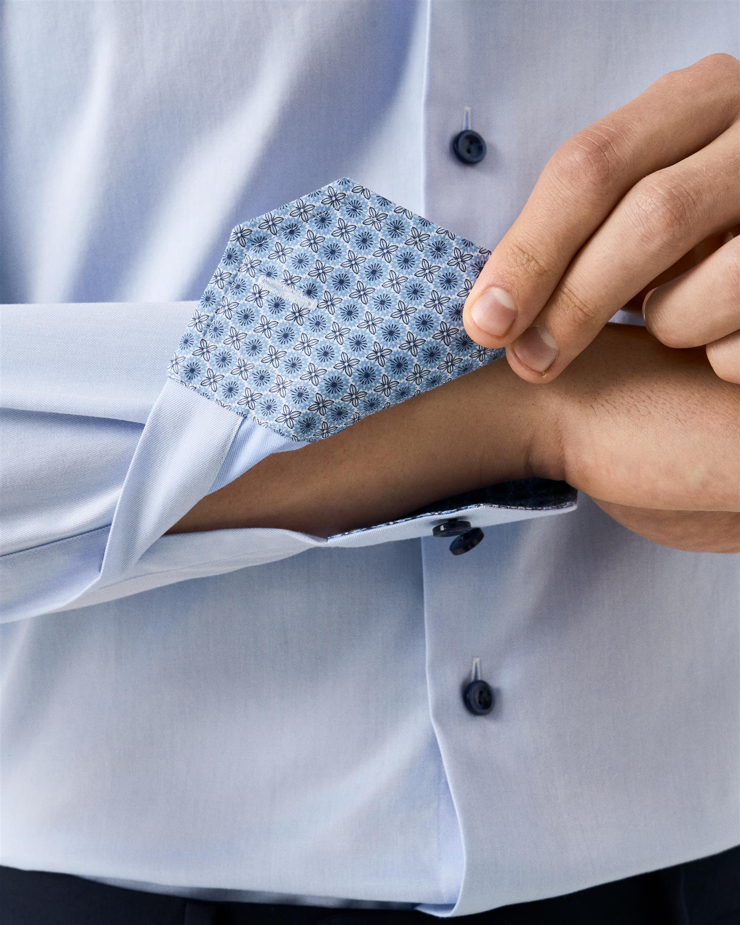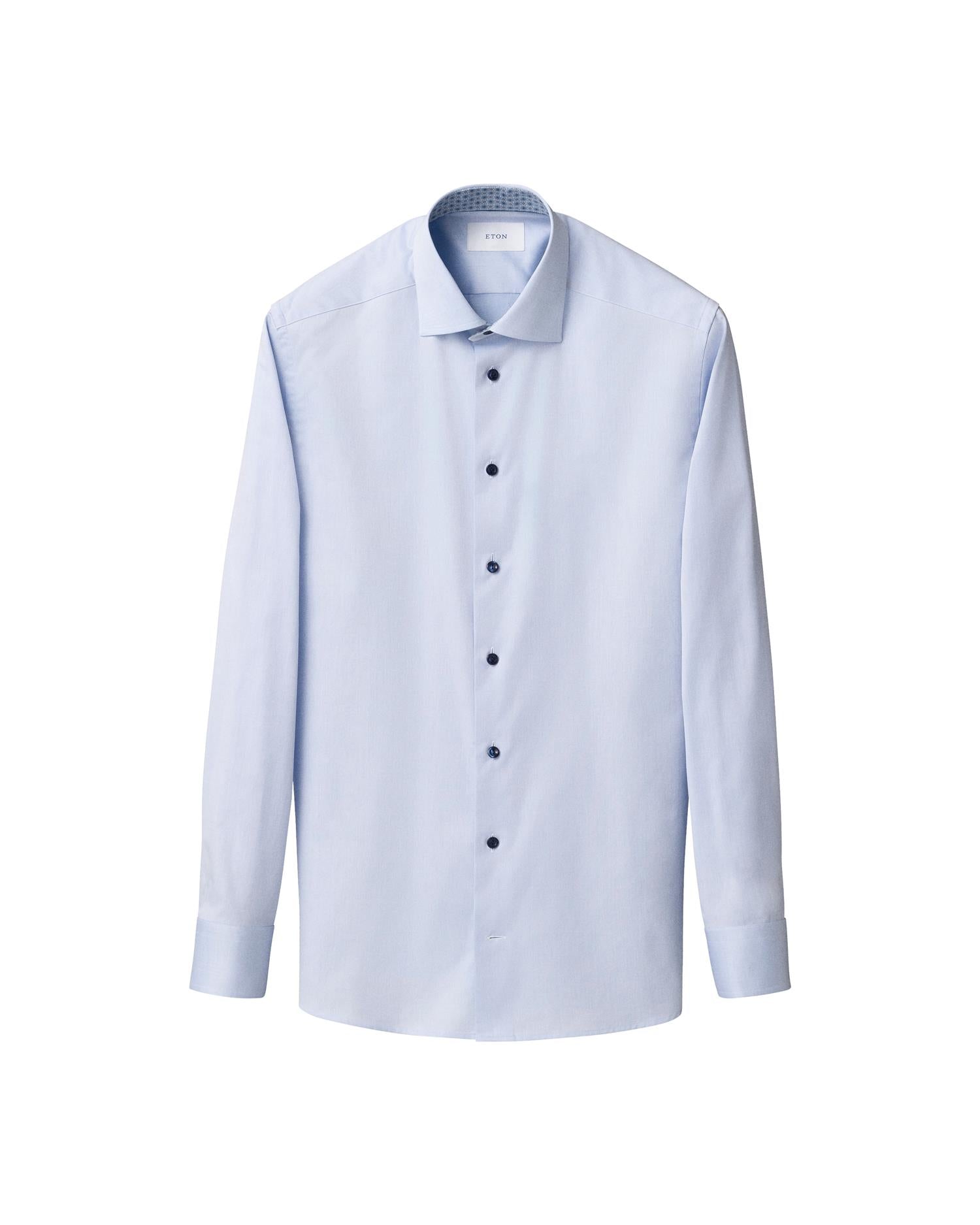 Lyseblå skjorte med kontrast i krage og mansjett, og mørkeblå knapper.