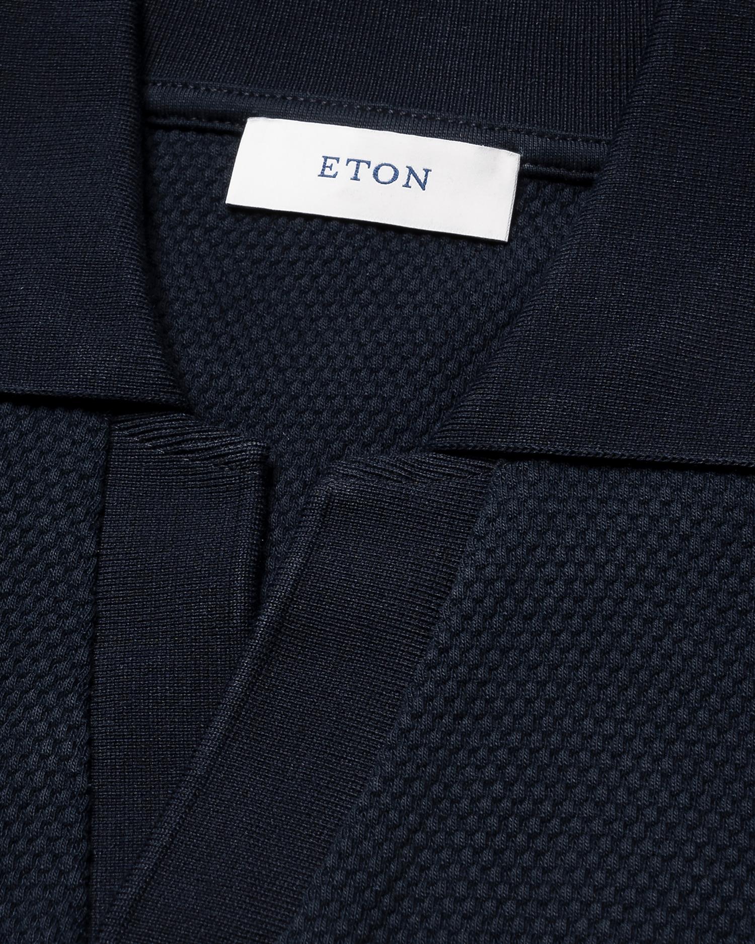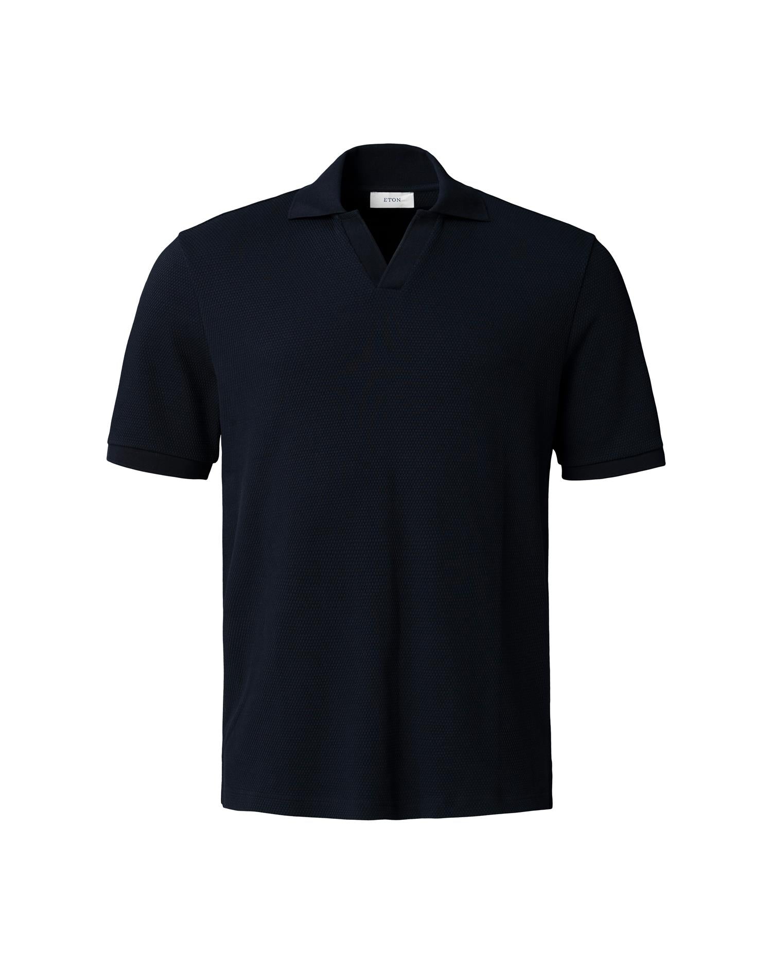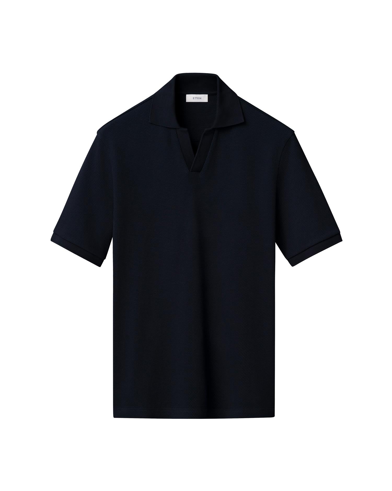 En kortermet poloskjorte laget av et interlock-bomullsjersey-jacquardstoff med et hint av elastan for ekstra fleksibilitet, og laget i vaffelstrikket materiale for et rikt utseende og en rik følelse. Den er designet for en vanlig passform og har en åpen krage for et avslappet, men likevel raffinert utseende.